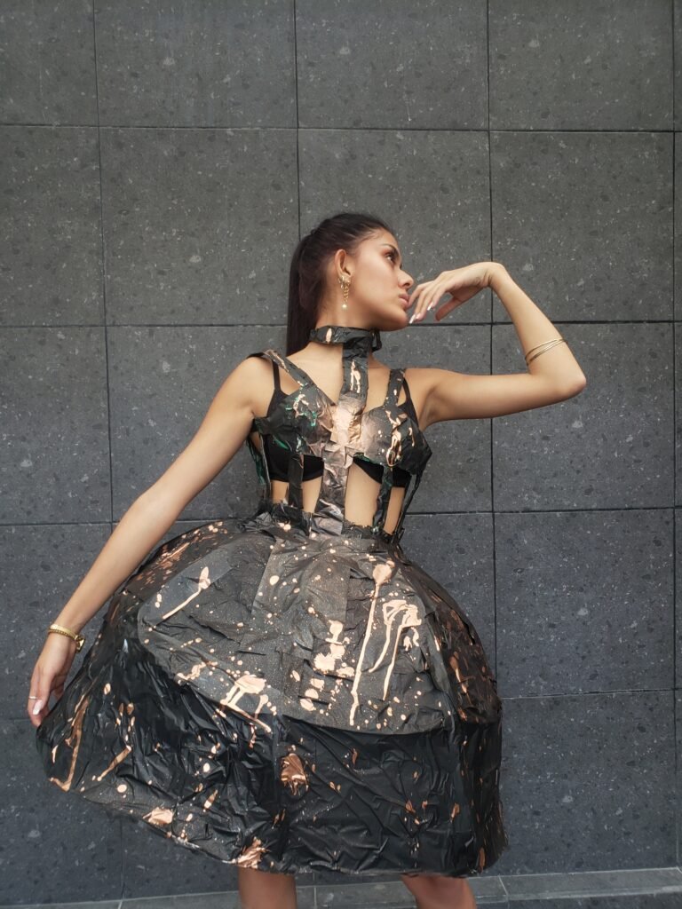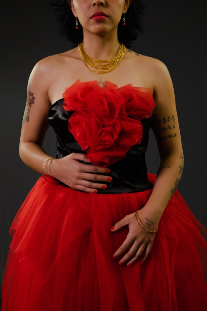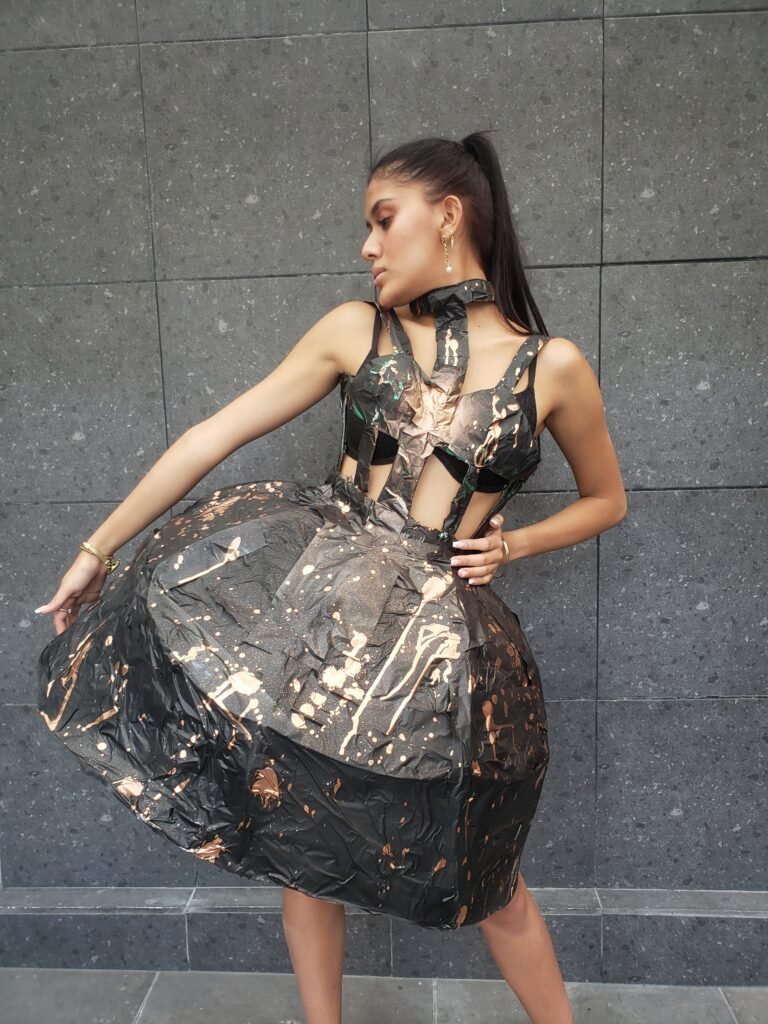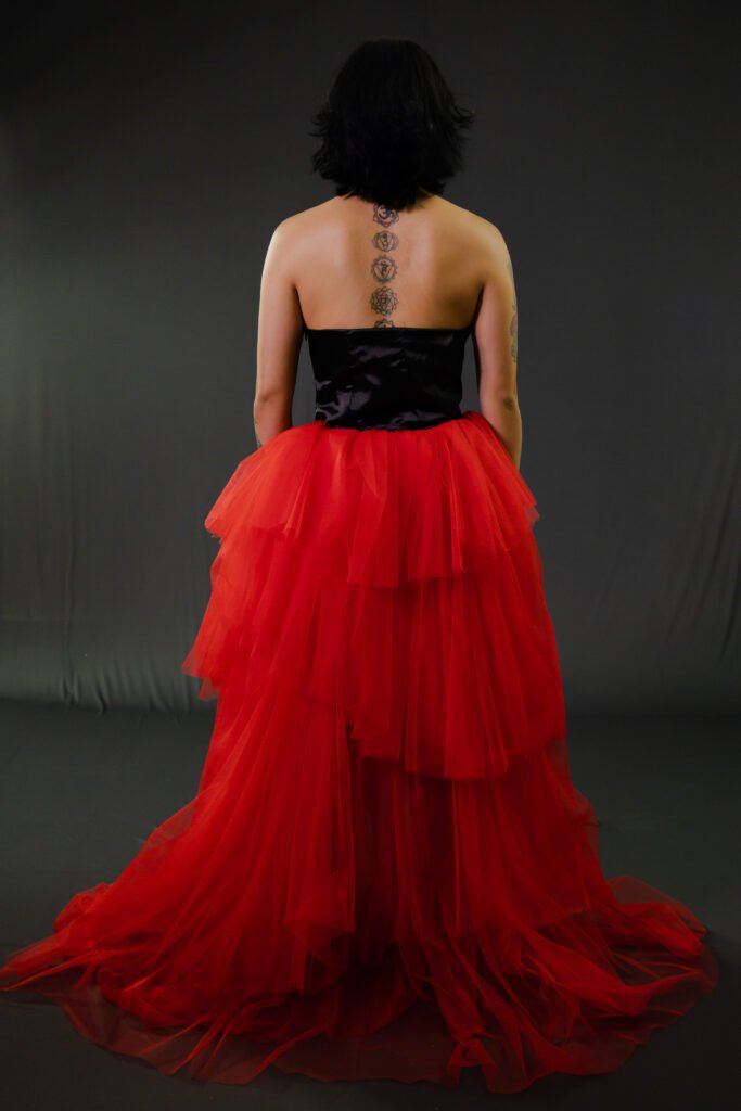 Este vestido esta inspirado en la obra “La columna rota” de Frida Khalo. Quise representar la rigidez de su cuerpo en esa etapa de su vida haciendo el vestido duro y sin movimiento. Las manchas de pintura evocan a los clavos en todo su cuerpo mientas que la mancha central simboliza el dolor emocional que sufría.