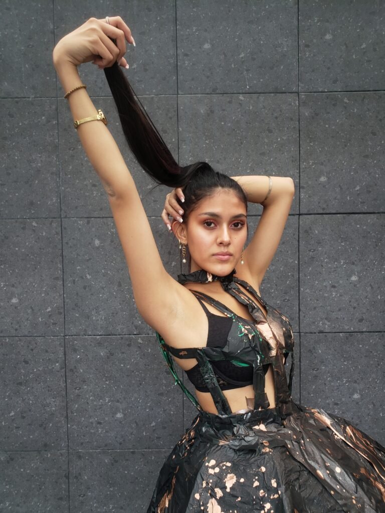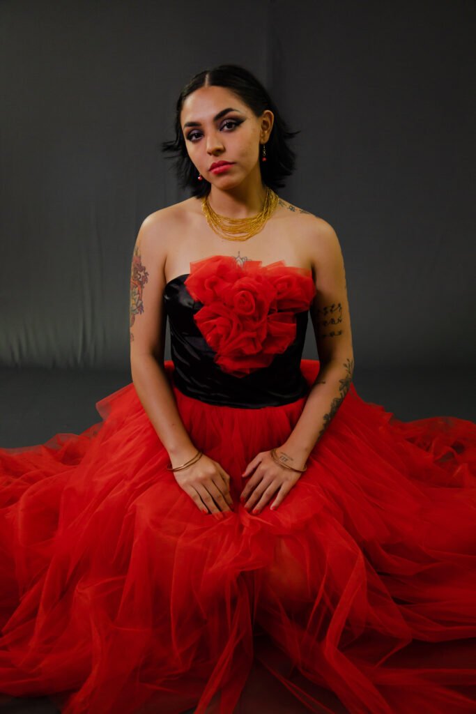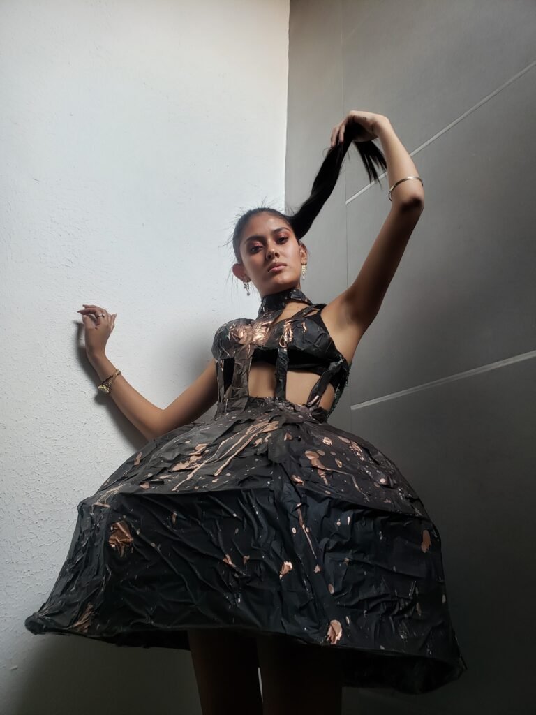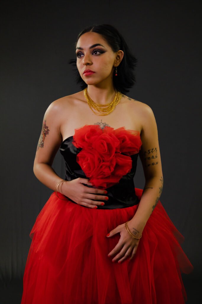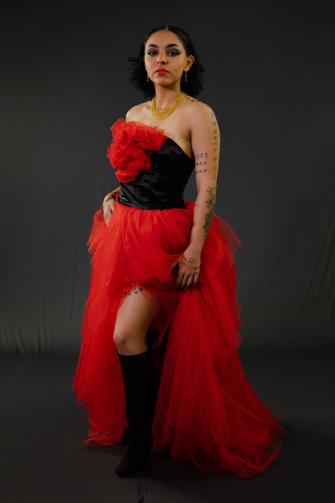 Este vestido esta inspirado en la obra “La columna rota” de Frida Khalo. Quise representar la rigidez de su cuerpo en esa etapa de su vida haciendo el vestido duro y sin movimiento. Las manchas de pintura evocan a los clavos en todo su cuerpo mientas que la mancha central simboliza el dolor emocional que sufría.