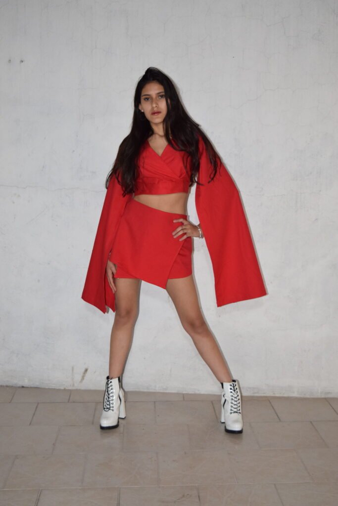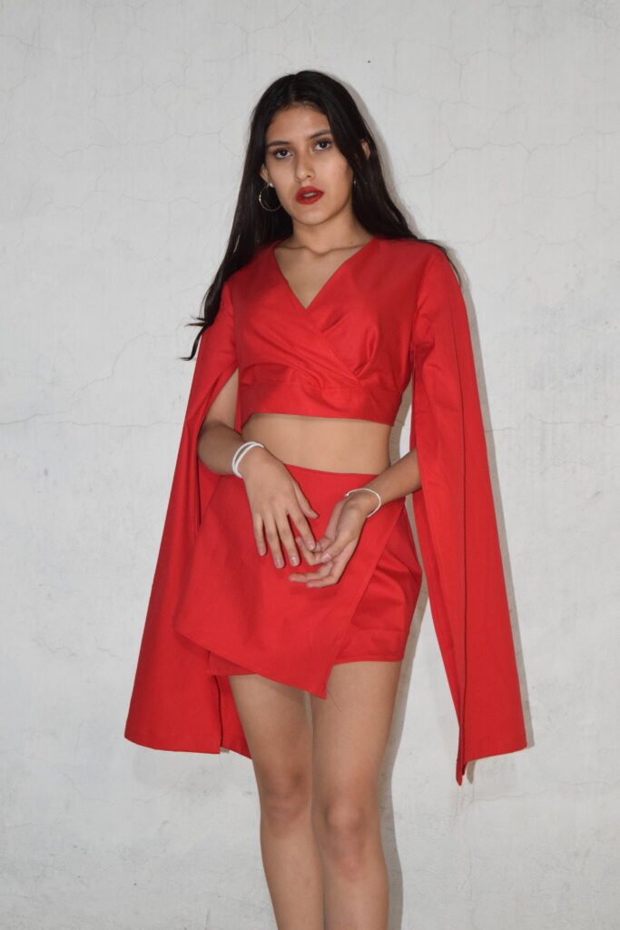 El conjunto Scarlet Flame es una explosión de elegancia y pasión en forma de moda. Confeccionado con exquisita gabardina roja, este conjunto se compone de una minifalda y un top que encarnan la sofisticación y el estilo.