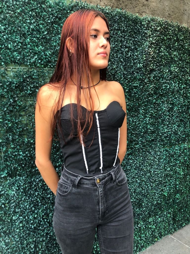 Bustier inspirado en Madonna realizado con un pantalón de traje vintage, con detalles de lentejuela en las varillas. ce uso de elementos como un espejo, un teléfono que simula ser fijo y una brocha de maquillaje.
